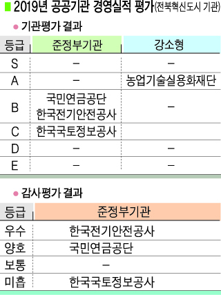 기획재정부가 실시한 '2019 공공기관 경영실적' 평가결과가 공개된 가운데 전북혁신도시 공공기관마다 희비가 엇갈렸다.