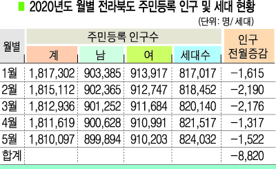 실제 지난달 말 기준 전북인구(주민등록기준)는 181만 여 명으로 올해 초보다 8820명이 줄어든 것으로 집계됐다. 이와 같은 추세라면 올해 전북인구는 1만5000여 명 이상의 감소할 전망이다. 전북의 인구감소 현상은 지난 5월 기준 전국 평균치보다 369명이 많다. 숫자로만 판단하면 경남과 경북 등 영남지역의 순유출 인구가 더 많지만 이들 지역 인구수는 각각 337만, 270만에 달한다는 점에서 본래 인구가 적은 전북지역의 사정이 더욱 심각하다는 분석이다.