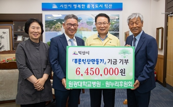 원광대병원(병원장 윤권하)과 원누리후원회(회장 윤권하)는 24일 정헌율 익산시장을 방문해 어려운 이웃을 위한 백미 100포(시가 250만원 상당)와 미세먼지 없는 쾌적한 도시환경 조성을 위한 성금 645만원을 각각 기탁했다.