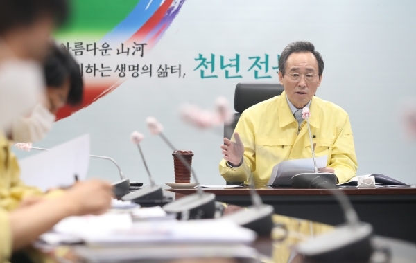 송하진 도지사가 최근 코로나19 진단감염원이 감지된 대전충남과 광주전남에 낀 전북지역 역시 ‘안전지대가 아니다’며 도내 기초자치단체장들에게 고강도 방역대책을 당부했다.
