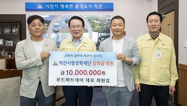 익산시 신동에 위치한 푸드마트데이 최원길 대표는 16일 정헌율 익산시장을 방문해 지역인재 육성을 위해 써 달라며 장학금 1000만원을 쾌척했다.