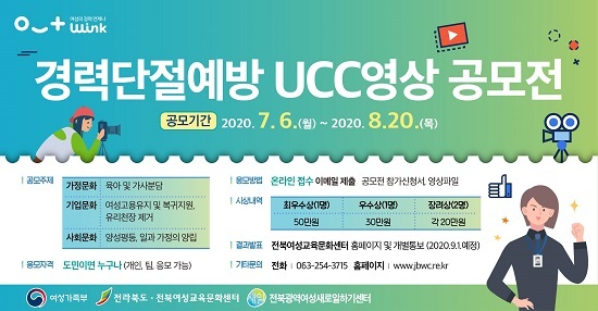 전북여성교육문화센터와 전북광역여성새로일하기센터(센터장 이윤애)가 일·생활 균형 문화 확산을 위한 W-ink 캠페인 일환으로 오는 8월 20일까지 ‘경력단절예방 UCC 공모전’을 개최한다.