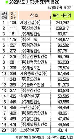 도내 종합건설업체 가운데 계성건설(주)이 2432억원을 기록하며 3년 연속 1위를 차지했다.
