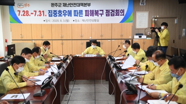 박성일 군수는 3일 오전 완주군 재난안전대책본부에서 실·국장과 13개 읍·면장 등 30여 명이 참석한 가운데 ‘집중호우 피해복구 긴급 점검회의’를 열고 지난달 28~31일 집중된 호우에 따른 2차 피해 예방에 행정력을 집중하라고 주문했다.