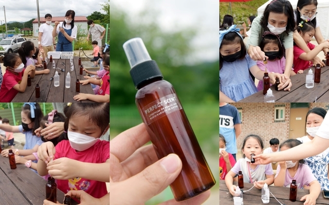 솔다박 체험 휴양마을에서는 천연 솔방울 가습기 만들기, 대나무 부채 만들기, 산머루 와인 만들기 등 다양한 체험을 할 수 있는데요. 모기가 극성을 부리는 여름철에 아이들과 함께 천연 아로마 오일의 향도 맡아보며 고사리 같은 손으로 한 방울씩 정성스럽게 천연 모기 퇴치제를 만들어 보았습니다. 500ml 스프레이 용기에 방충 기능이 뛰어난 시트로넬라 9방울, 해충을 쫓는 레몬그라스 9방울, 진드기 퇴치 성분이 뛰어난 시나몬 4방울, 코가 뻥~~~ 비염에도 좋은 유칼립투스 4방울, 가려움 진정에 효과가 있는 라벤더 4방울을 넣고 향수 베이스를 채운 뒤 살살 흔들어 주면 완성됩니다.