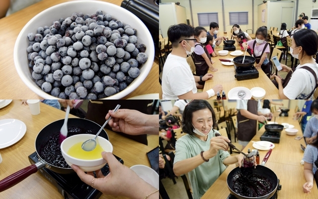 무주에는 머루뿐만 아니라 블루베리도 많이 재배하고 있는데요. 안토시아닌, 항산화질, 식이섬유가 많이 함유되어 있어 특히 눈 건강에 좋은 블루베리를 이용해 블루베리청을 아이들과 함께 만들어 보았습니다. 재료는 블루베리(1kg), 설탕(500g), 레몬즙 3~4푼과 정성스런 손길이면 충분합니다. 블루베리청은 잼을 만드는 것이 아니므로 블루베리가 바르르 끓을 때 설탕을 넣은 후 조금 걸쭉하게 될 때까지 저어가며 레몬즙을 넣고 한번 더 끓여주면 완성됩니다. 토스트와 함께 블루베리청을 먹으니 과육이 풍부해 씹는 맛이 좋습니다.