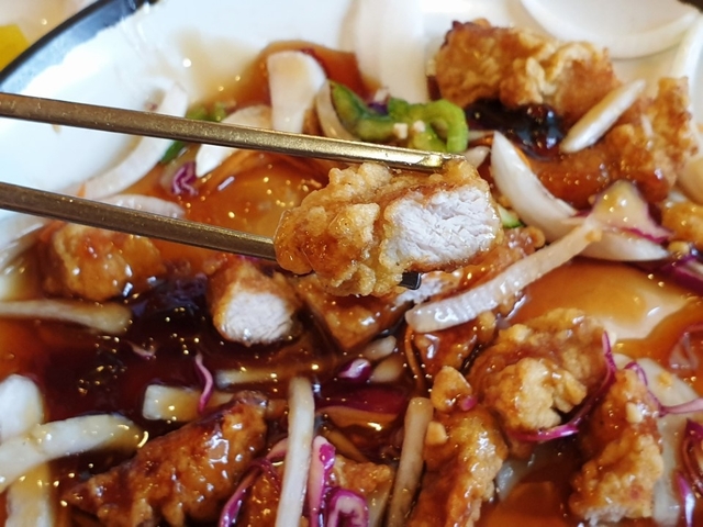 전라북도와 무주군에서 인정한 착한가격 모범업소 천마루(중화요리 전문점)는 숙소에서 자동차로 5분 거리인데요. 무주지역특산물인 천마를 이용한 천마면 짜장, 머루소스 탕수육, 큼직한 갈비가 일품인 해물갈비짬뽕이 가격까지 착해서 그 맛을 더합니다. 덕유산 I.C 근처에 있어 접근성도 좋습니다.