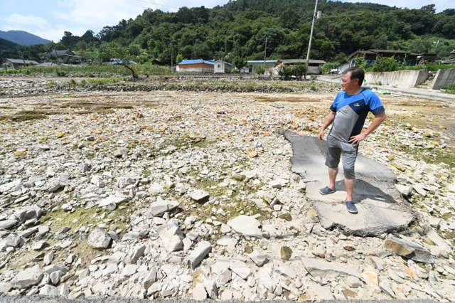진메마을 문경섭 이장은 3년간 공들인 느티나무 묘목이 전부 물거품이 됐다. 비싼 돈을 들여 25톤 트럭 4대 분량의 토사를 사 밭을 꾸렸지만 한순간에 모든 것이 휩쓸려 날아갔다. 그는 지난 8일 새벽부터 잠에 들지 못했다. 장대비가 쉬지 않아 새벽 4시께 나와 보니 마을길은 이미 잠겨버린 상태였다고 한다.