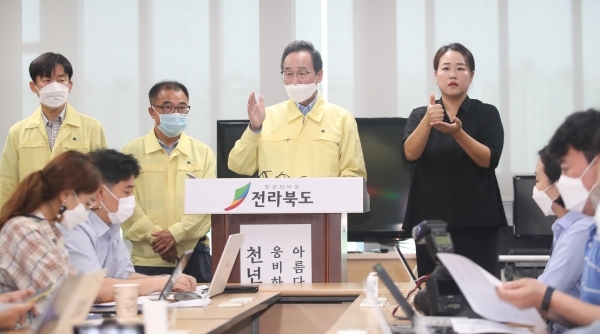 송하진 전북도지사가 22일 오후 3시 전북도청 기자실에서 정부의 전국 사회적 거리두기 2단계 강화 조치에 따른 도민의 적극적인 참여를 당부하는 대도민 호소문을 발표했다.