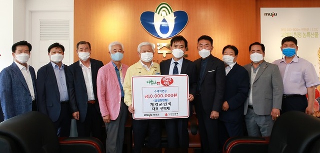 지난 21일 재경 무주군민회(회장 신덕재)가 수해복구지원을 위해 써달라며 1000만원의 성금을 무주군에 기탁했다.