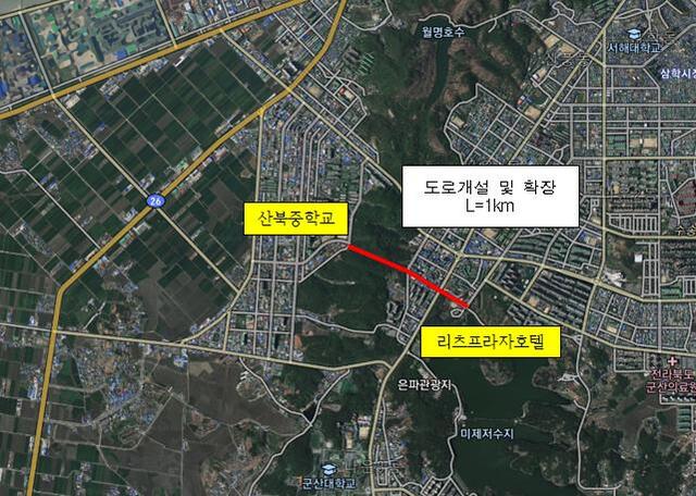 군산시에 따르면 총 250억 원을 들여 산북중~유원아파트~리츠프라자호텔 앞까지 총연장 1km·폭 15~23m의 도로를 개설 및 확장하는 사업을 추진하고 있다.