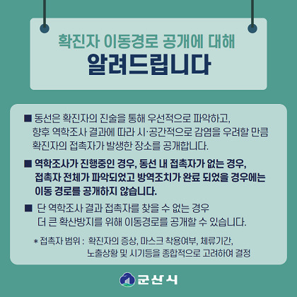 시 관계자는“군산시의 동선공개의 경우 중앙방역대책본부의 지침대로 하고 있는 것”이라며 “확진자가 머문 공간(식당 등)의 경우 역학조사 등을 통해 접촉자를 파악하고, 만약 접촉자가 없거나 혹은 접촉자가 발생했어도 신원을 모두 파악했다면 장소 등을 비공개 원칙으로 하고 있다”고 설명했다.