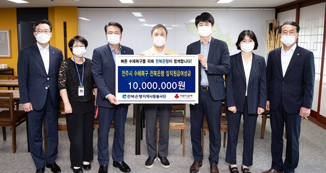 전북은행지역사랑봉사단은 향토은행으로서 긴 장마와 폭우로 큰 피해를 입은 지역사회의 아픔을 같이 나누고 빠른 수해복구에 동참하여 사랑 나눔을 실천하고자, 전 임직원의 급여의 1%를 특별성금으로 조성한 1000만원을 전주시에 전달했다.