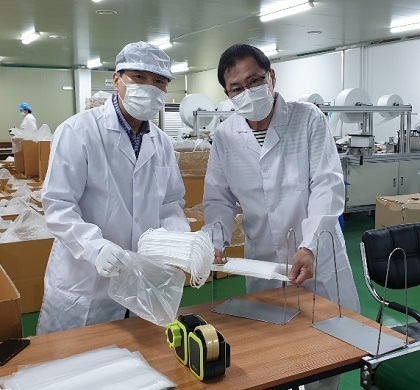 박 총재는 코로나19 여파로 외국인 근로자가 줄어 일손이 부족한 공장을 찾아 공장 직원들과 함께 마스크 생산에 참여했다.