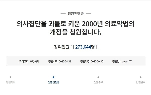 지난달 31일 청와대 국민청원 게시판에 올려진‘의사집단을 괴물로 키운 2000년 의료악법의 개정을 청원합니다’는 글에도 27만명이 동의했다(3일 오후 5시). .