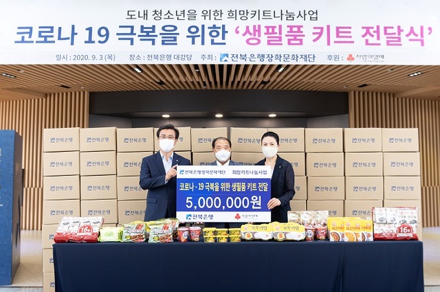 (재)전북은행장학문화재단(이사장 김영구)은 최근 전북은행 본점에서 ‘코로나19 극복을 위한 생필품 키트 전달식’을 실시했다.