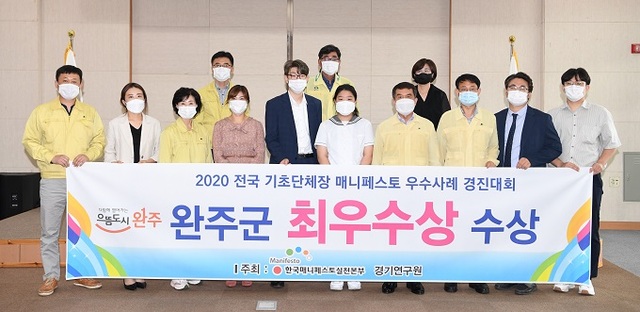 13일 완주군에 따르면 한국매니페스토실천본부와 경기연구원 공동 주최로 최근 열린 ‘2020년 전국 기초단체장 매니페스토 우수사례 경진대회’에서 ‘초고령화 대응’과 ‘안전자치’ 등 2개 분야 최우수상을 수상해 2관왕의 대업을 유지했다.