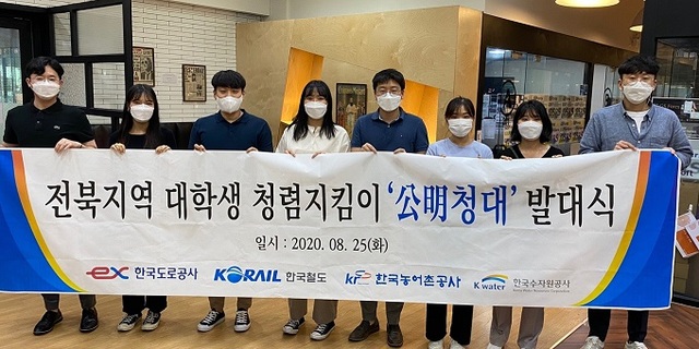 전북지역 내 4개 공공기관(한국농어촌공사·한국수자원공사·한국도로공사·한국철도공사 전북본부)은 지난 8월부터 지역 내 대학생들로 구성된 대학생 청렴지킴이 ‘公明청대’를 운영하고 있다고 13일 밝혔다.