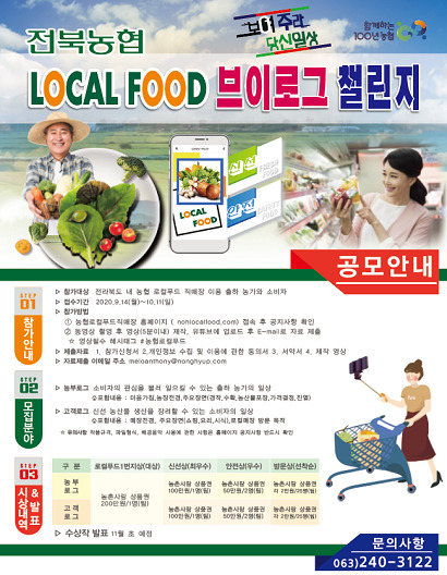 전북농협(본부장 박성일)은 지속가능한 로컬푸드 가치 확산과 푸드플랜 기반을 구축하기 위해 ‘전북농협 로컬푸드 브이로그 챌린지’ 영상 공모전을 진행한다고 15일 밝혔다.