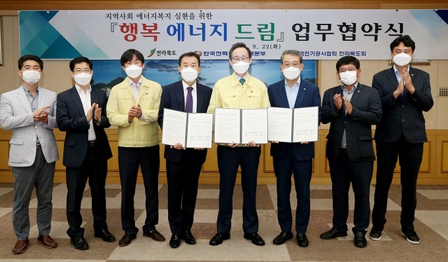 전북도가 22일 한국전력공사 전북본부, 한국전기공사협회 전북도회와 함께 신재생에너지 보급 및 에너지복지 확대 추진을 위한 업무협약을 체결했다.
