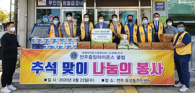 전주중앙라이온스클럽(회장 김병남)이 추석을 맞아 어려운 이웃에게 온기를 전달하고자 호성동주민센터에 백미 20포와 라면 20박스, 화장지 20팩을 23일 전달했다.