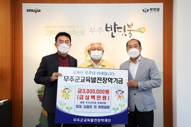 재경무주군민회 미래포럼에서 무주군교육발전장학재단 측에 장학금 300만 원을 전달했다. 24일 진행된 기탁식에는 미래포럼 김철호 회장과 박지용 총무, 재경군민회 고귀선 사무총장, 무주읍민회 신동일 사무국장 등이 함께 했다.
