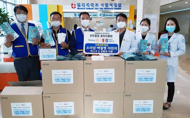 국제로타리 3670지구 전주중앙로타리클럽은 전북대병원 소아암센터를 방문해 소아암 환자들에게 200만 원 상당의 마스크와 문화상품권을 전달했다고 27일 밝혔다.