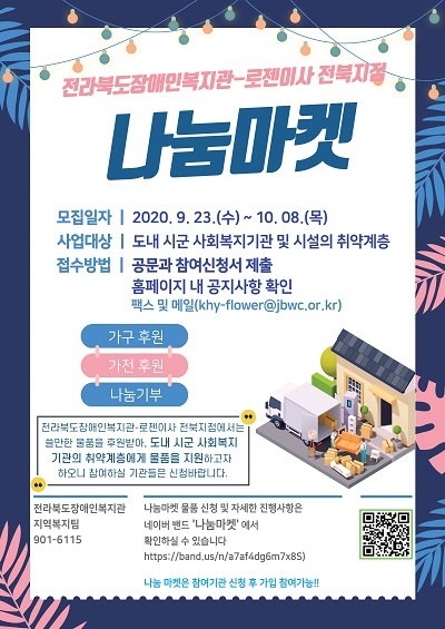 오는 10월 8일까지 참여 신청 가능한 나눔 마켓은 전라북도장애인복지관에 후원된 물품을 도내 사회복지기관과 시설 등에 매칭돼 필요 물품에 따라 지원될 예정이다.