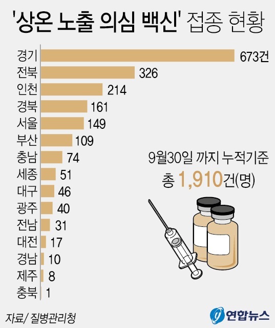 ◇ 상온 노출 의심 독감백신 접종자, 경기 > 전북 > 인천 등…지침 미준수도 속속 확인 질병관리청은 1일 '인플루엔자 예방접종사업 관련' 참고자료를 내고 "현재 상온노출 여부를 조사 중인 정부조달 (백신) 물량을 접종한 건수는 어제(9월 30일) 기준으로 총 1천910건(명)"이라고 밝혔다.