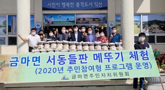 익산시 금마면 주민자치위원회(위원장 조우형)가 주민참여형 프로그램 일환에서 추진하고 있는 ‘서동들판 메뚜기 체험현장’을 통해 수확한 서동메뚜기쌀을 관내 저소득층에 전달했다.