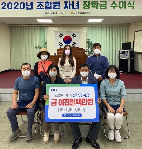 익산 오산농협(조합장 채병덕)은 지난달 29일 조합원 자녀 대학생 100만원, 고등학생 50만원씩 총 23명에게 2100만원의 장학금을 전달했다.