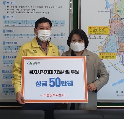 마음꽃복지센터(센터장 서경범)가 완주군 봉동읍에 복지사각지대를 위기가정 지원을 위한 기부금 50만원을 전달했다.