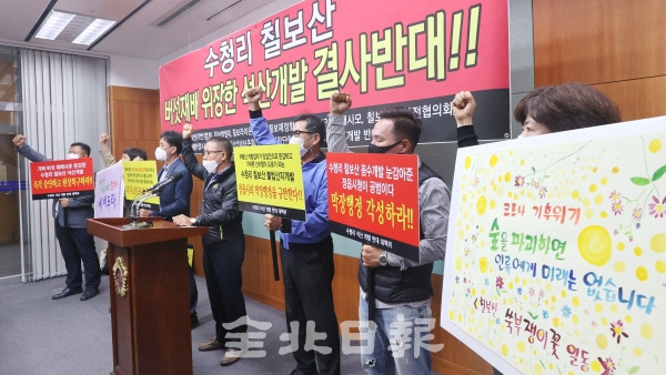 전북환경운동연합 등 29개 시민사회단체는 7일 전북도의회 브리핑룸에서 기자회견을 열고 “정읍시 산림녹지과는 강남의 부동산 개발업자가 2019년 11월에 급조해 만든 유령회사 S농산을 임업인으로 인정하고 산지전용 신고를 수리해 주었다”며 전북도에 주민감사를 청구했다.