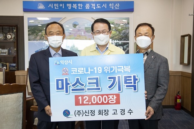 익산 신흥동 소재 ㈜신정 고경수 회장은 지난 8일 정헌율 익산시장을 방문해 코로나19 지역사회 감염 예방을 위해 써 달라며 마스크 1만2000장을 쾌척했다.