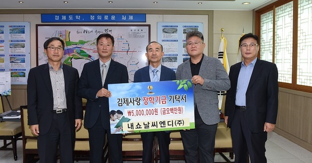 내쇼날씨엔디㈜가 코로나 19 장기화로 인해 어려운 경제여건 속에서도 학업에 전념하는 지역 학생들을 위해 써달라며 김제 사랑장학재단에 장학기금 5백만 원을 13일 기탁했다.