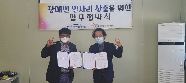 전라북도장애인복지관(관장 정호영)이 (사)다울장애인협회 디오텍과 함께 지난 19일 장애인 일자리 창출을 위한 업무협약을 체결했다.
