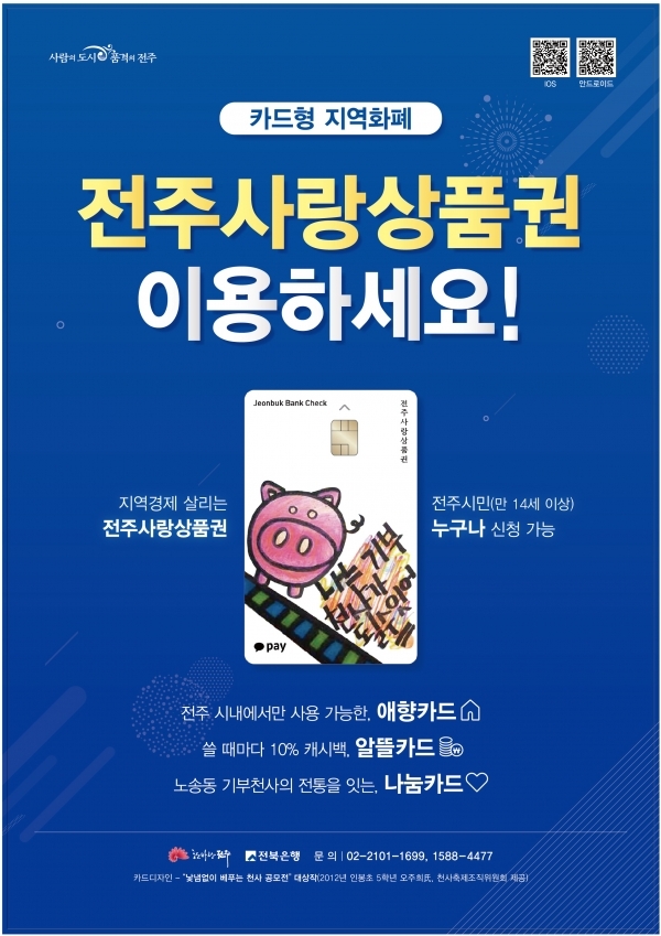 시 관계자는 “전주사랑상품권은 코로나19로 침체된 지역 경제에 새로운 전기를 가져올 경제 활성화 모델이다. 지역 내 경제 선순환을 유도하고 기부문화가 확산될 수 있도록 노력하겠다”고 밝혔다.