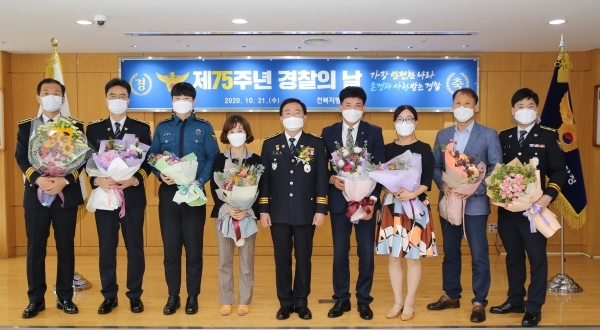 전북지방경찰청(청장 진교훈)은 21일 제75주년 경찰의 날을 맞아 훈·포장 및 감사장, 표창대상자와 일부 직원 등 50여 명이 방역지침을 준수한 가운데 기념식을 가졌다.