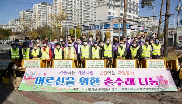 이날 기탁식에는 정헌율 익산시장과 엄양섭 익산시자원봉사센터 이사장, 이리배산라이온스클럽 박상근 회장 및 자원봉사자, 손수레 대상자 어르신 등 50여명이 자리를 함께 했다.