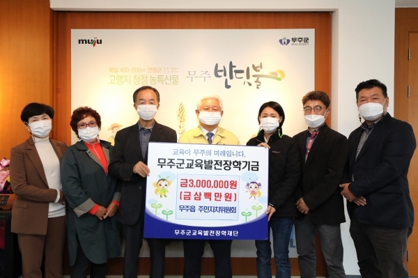 무주읍 주민자치위원회(위원장 박남수)가 지난해부터 현재까지 임기동안 모아온 회비 300만원을 지역인재양성에 써달라며 무주군교육발전장학재단 측에 전달했다.