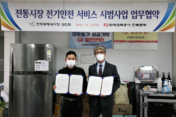 한국전력공사 전북본부(본부장 이경섭)와 전주 모래내시장 상인회(회장 이완열)은 지난 22일 전주 모래내시장 상인회 사무실에서 전통시장 전기안전 서비스 시범사업에 대한 업무 협약을 체결했다.