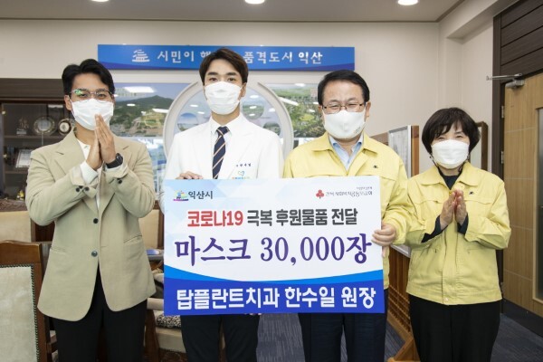 익산 탑플란트치과(대표원장 한수일)는 3일 익산시를 방문해 코로나19 위기극복을 위해 써 달라며 덴탈마스크 3만장(시가 600만원 상당)을 기탁했다.