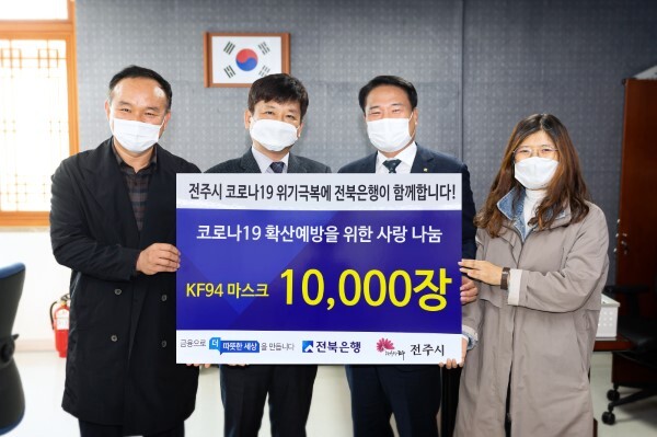 JB금융그룹 전북은행(은행장 임용택)은 10일 전주시청 부시장실에서 ‘전주시 코로나19 확산예방을 위한 KF94 마스크 전달식’을 실시했다.