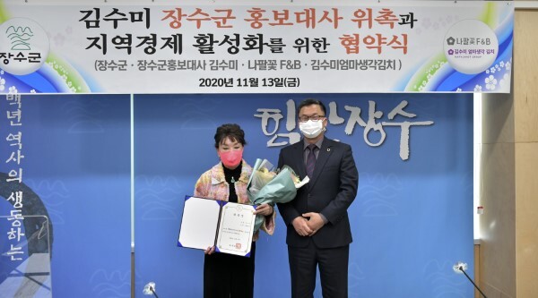 이번 협약을 통해 장수 농공단지 입주업체 김수미 엄마생각김치는 지역경제활성화를 위한 일자리창출 및 지역 농산물의 안정적 판로 구축, 지역 농·특산물 유통활성화를 위한 지원 등 기업과 장수군 상호 협력키로 했다.
