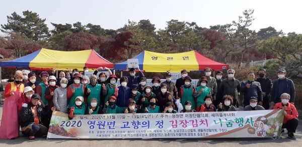 영원면이장단협의회와 새마을부녀회가 주관한 김장 나눔 행사에는 김철영 면장 직원, 주민 등 300여 명이 참여해 마스크 착용과 발열체크, 손 소독등 방역 수칙을 준수하며 김장김치 4000Kg을 담갔다.
