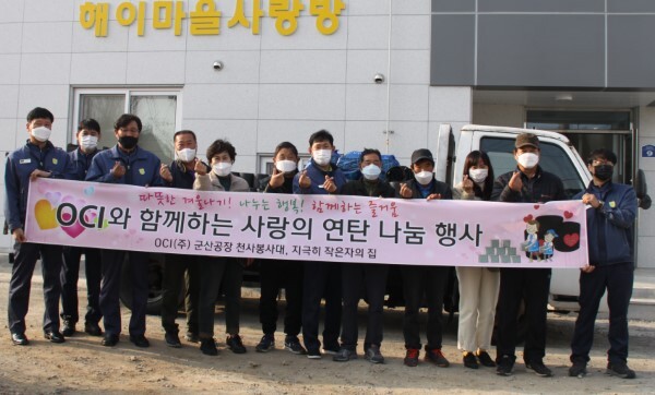 OCI(주) 군산공장 천사봉사대는 16일 공장 인근 결연마을에서 어려운 이웃들을 위해 연탄 4000장을 후원하는 전달식을 가졌다.