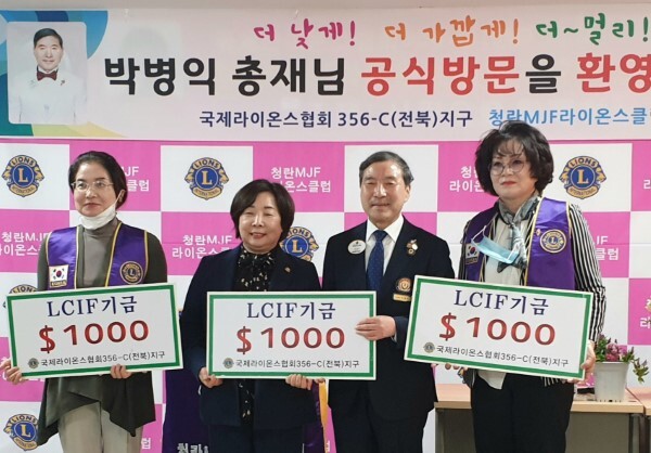 익산청란MJF클럽(회장 이순안)은 24일 지구 사무실에서 국제라이온스협회356-C지구 박병익 총재에게 지구운영성금과 LCIF기금을 기탁했다.