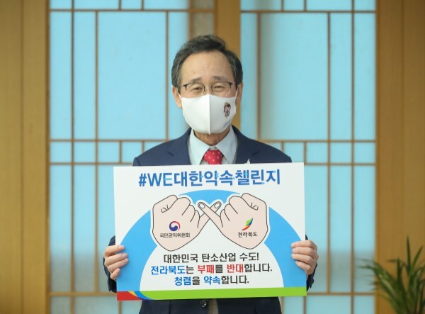 송하진 전북도지사가 도민이 신뢰하는 청렴 전북 실현 다짐과 부패를 반대하고 청렴을 약속하는 마음을 담아 ‘WE(위)대한약속 챌린지’ 캠페인에 동참했다.