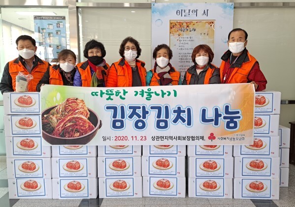 완주군 상관면 지역사회보장협의체(공동위원장 정규호, 이순덕)는 최근 김장김치 35박스(200kg)를 준비해 경제적, 신체적 어려움을 겪는 독거노인, 한부모가정 등 취약계층 가정에 전달했다.