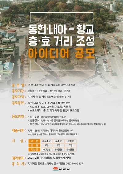 김제시는 점차 슬럼화 되어가는 구도심(전통시장) 일원을 성산지구 도시재생사업과 연계하여 지역경제 활성화를 위한‘동헌·내아-향교 충·효 거리 조성 아이디어’를 공모한다고 1일 밝혔다.
